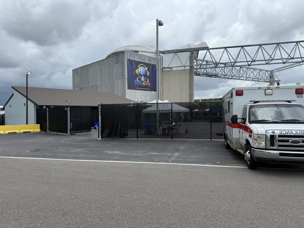 You enter through the gate where security is set up (sign says Vendor Entrance) after the ambulances.